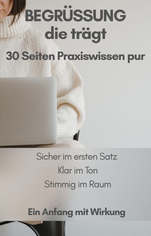 Neben der Einordnung enthält das Buch einen klar ausgearbeiteten Praxis Teil: mit vollständig ausformulierten Beispiel Begrüßungen, Sprach Boxen zu Tempo und Pausen sowie einer kompakten Checkliste für die Vorbereitung. Du findest darin typische Stolperstellen aus der Praxis und konkrete Fragen, die dir helfen, einen Anfang zu schreiben, der stimmig bleibt.